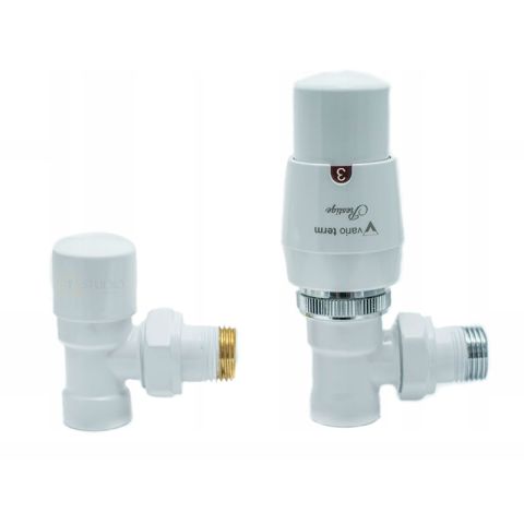 Радіаторний комплект з термоголовкою Vario Term Royal White (Білий матовий, кутовий) - для підключення радіатора та точного налаштування температури в приміщенні. Радіаторний комплект розроблений для бічного підключення радіаторів і рушникосушарок, забезпечуючи надійну роботу, зручний монтаж та естетичний зовнішній вигляд у будь-якому інтер’єрі.