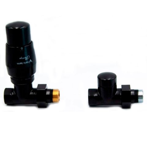 Радіаторний комплект з термоголовкою Vario Term Royal Black (Чорний матовий прямий) - для підключення радіатора та точного налаштування температури в приміщенні. Радіаторний комплект розроблений для бічного підключення радіаторів і рушникосушарок, забезпечуючи надійну роботу, зручний монтаж та естетичний зовнішній вигляд у будь-якому інтер’єрі.